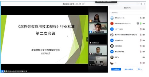 中國散協團體標準《濕拌砂漿應用技術規(guī)程》第二次標準編制工作會議于2020年5月22日上午9:30-11:30以網絡會議的形式召開。中國散裝水泥推廣發(fā)展協會秘書長、建筑材料工業(yè)技術情報研究所混凝土發(fā)展中心主任孫繼成博士、中國散裝水泥推廣發(fā)展協會專家委員計海霞高工、建筑材料工業(yè)技術情報研究所標準編制工作組楊莉、中建西部建設北方有限公司技術中心經理張凱峰、成都精準混凝土有限公司經理馬占民、山東弗爾曼新材料集團有限公司經理肖維錄、主任薛俊書、廣東浪淘砂新型材料有限公司研發(fā)中心主任曹小榮、黃山精強建材股份有限公司副總經理程楷、四川同舟化工有限公司技術片區(qū)負責人鄧奎、中信國安建工集團有限公司總工張學華、麗水市處州混凝土有限公司總經理楊磊、實驗室主任金滿昌;株洲市中建新材料有限公司總經理陳新、青島國基商砼有限公司郇建、昆明匯森混凝土有限公司杜顯茂等41名代表參加了會議。會議由建筑材料工業(yè)技術情報研究所楊莉主持。首先主編單位中國散裝水泥推廣發(fā)展協會秘書長、建筑材料工業(yè)技術情報研究所孫繼成博士介紹了標準編制要求以及編制工作進度計劃。隨后,中國散裝水泥推廣發(fā)展協會專家委員、主編單位標準編制負責人計海霞高工就濕拌砂漿行業(yè)現狀、標準中創(chuàng)新點和關鍵點進行介紹。標準編制組建筑材料工業(yè)技術情報研究所楊莉詳細介紹了標準文本及條款編制說明,并組織參會代就凝結時間、保塑時間、14拉伸粘結強度等關鍵技術參數進行交流討論,廣泛征集參編單位意見。該會議的召開對標準編制工作起到了大的推進作用。標準編制負責人計海霞高工標準編制組工程師楊莉